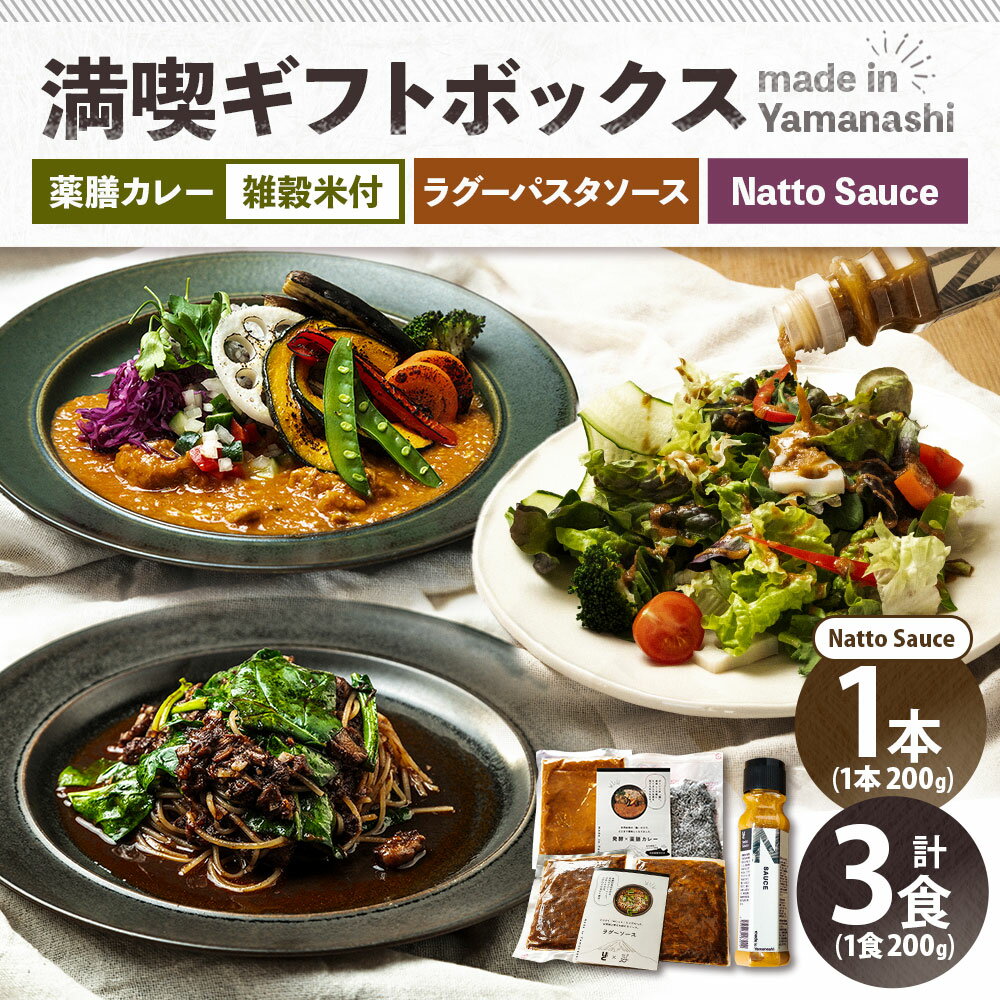 - 【ふるさと納税】満喫ギフトボックス 発酵×薬膳カレー・竹炭雑穀米・発酵牛すじのラグーパスタソース・Natto Sauce 合計1kg(200g×5) ソース カレー 惣菜 雑穀米 お米 ごはん ご飯 調味料 納豆 酵素 健康 美容 贈答 贈り物 お祝い お返し 冷凍 山梨県 中央市 送料無料