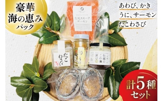 - 豪華 海鮮5種 海の恵みパック [たみこの海パック 宮城県 南三陸町 m304amh560091] 魚介類 海鮮 うに ウニ アワビ あわび 鮑 サーモン 銀鮭 鮭 牡蠣 カキ たこわさび 詰め合わせ