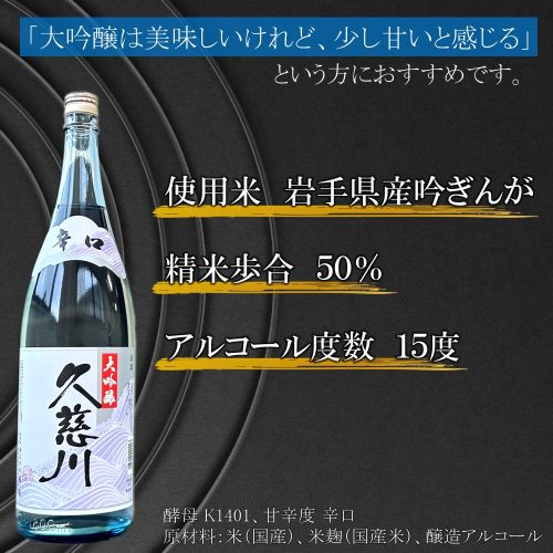 - \最短5営業日以内発送!発送月も選べる/【蔵元直送】「辛口大吟醸 久慈川 1.8L」(日本酒 酒 さけ sake アルコール お祝い 縁起 岩手県産 米 吟ぎんが 精米歩合 50% 15度 酵母 K1401 人気 おすすめ お取り寄せ 贈答 ご自宅用 プレゼント 送料無料)