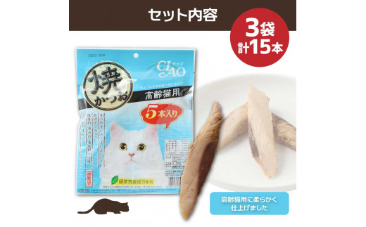 シニア猫用キャットフード いなば チャオ・焼かつお(1種類5本入×3袋セット)ペットフード 高齢猫 猫 ネコ スティックタイプ 消臭 カツオ 魚肉 おやつ ごはん ご褒美 国産品 高知県 土佐清水市【R00042】