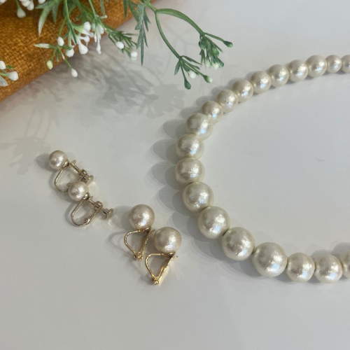 - コットンパール「キスカ」シンプルショートネックレス(金具ゴールド)とイヤリング2点セット 結婚式 | 二次会 パーティー 入学式 卒業式 華やか