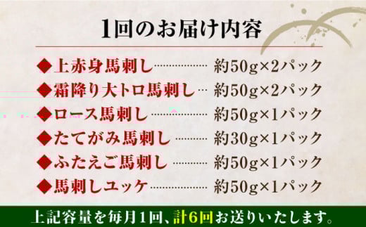 【全6回定期便】 国産 馬刺し 計380g 約7人前 熊本馬刺し ばさし 食べ比べ セット 上赤身馬刺し 霜降り(大トロ) たてがみ フタエゴ 馬刺しユッケ ロース馬刺し 冷凍 馬肉 馬刺 ヘルシー 馬肉 小分け【株式会社 利他フーズ】 [AYBP003]
