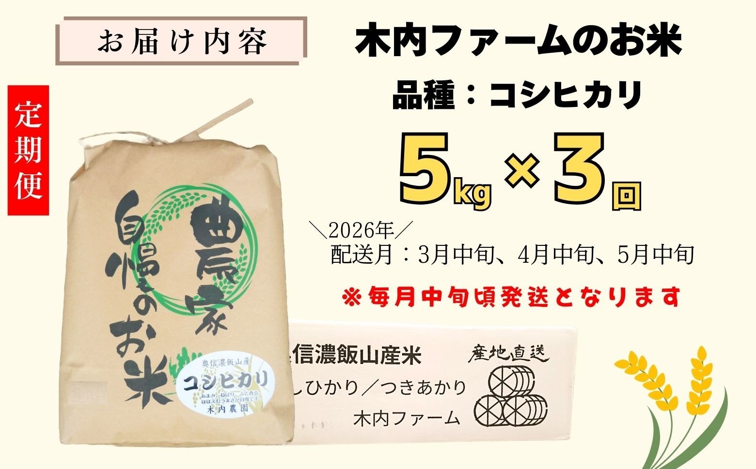 - <2026年3月中旬より3回> 定期便 5kg×3回 《 品種:コシヒカリ 》奥信濃飯山〜木内ファームのお米〜 (7-14C-03)