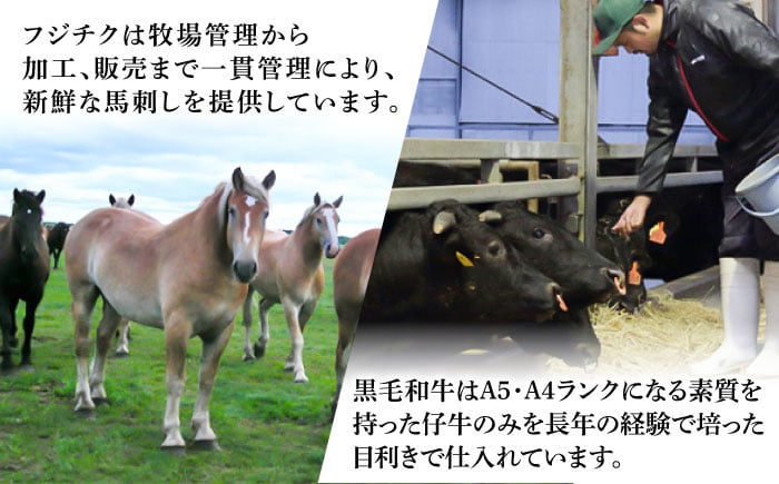 【全3回定期便】「フジチクオリジナル」ふじ馬刺しと藤彩牛の贅沢食べ比べセット 3906 / 熊本馬刺し 馬刺 馬刺し 黒毛和牛 ロース 国産 醤油付き 生姜付き 熊本 菊陽 【株式会社フジチク】 [BHAD054]