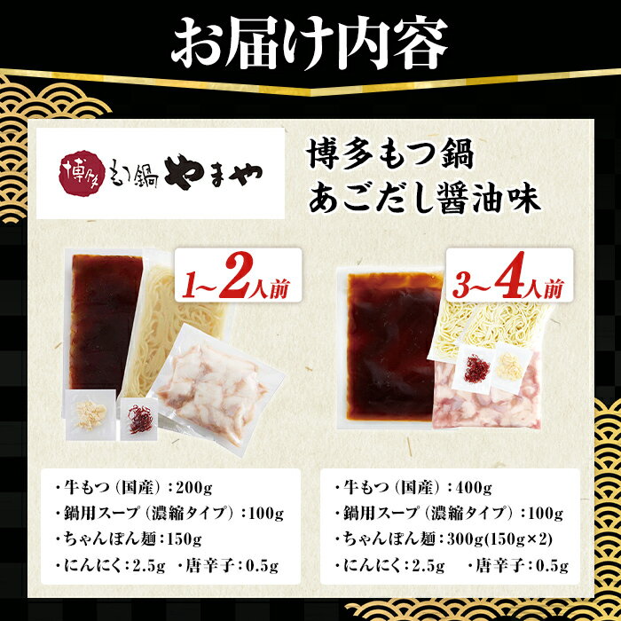 【ふるさと納税】≪内容量選べる≫ 博多もつ鍋やまや もつ鍋セット あごだし醤油味 (1~4人前) もつ鍋 お鍋 もつ モツ 牛もつ 国産 小腸 牛小腸 博多 醤油味 1人前 2人前 3人前 4人前 あごだし セット ちゃんぽん麺 チャンポン麺 麺 【やまやコミュニケーションズ】
