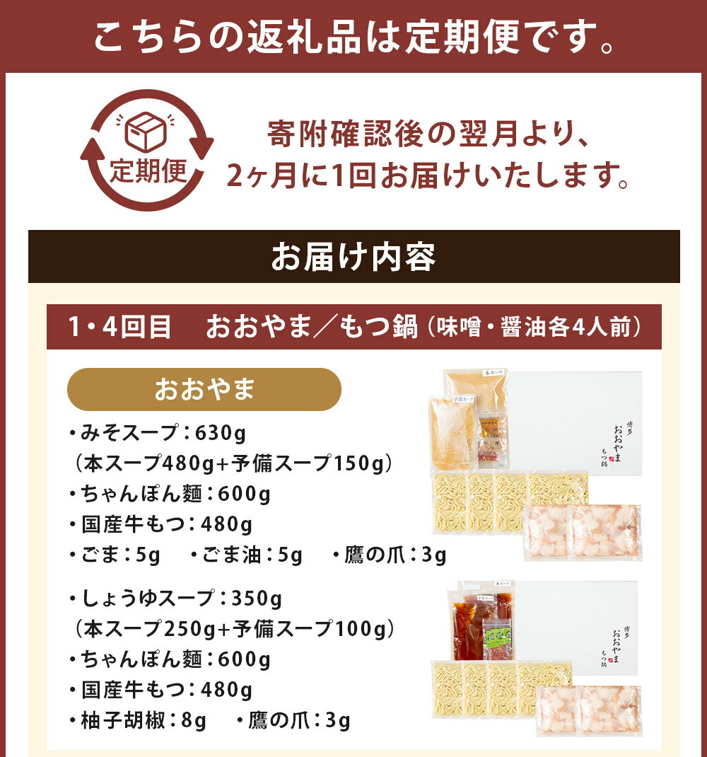 【ふるさと納税】<選べる定期便>【隔月定期便(計3回・6回発送)】鍋大容量定期便! 2ヶ月毎 おおやま・上田商店・華味鶏 もつ鍋 モツ鍋 水炊き 牛もつ ちゃんぽん麵 醤油 味噌 しょうゆ みそ 牛肉 お肉 惣菜 鍋料理 麺類 冷凍 福岡県 嘉麻市 送料無料