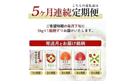 - 【定期便】 無洗米 5銘柄(ササニシキ 雪若丸 ひとめぼれ はえぬき つや姫)食べ比べセット 各5kg 5ヶ月連続 計25kg(5月~9月)