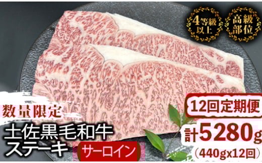 - 【定期便12回】土佐黒毛和牛サーロインステーキ 計5.28kg(440g×12ヶ月連続お届け) 2Tコース | 特撰 サーロイン肉 最上位等級 A4 A5 最高 ランク 贅沢 厚切り ステーキ用 焼肉用 キャンプ飯 国産 牛肉 高知県 須崎市 TM48000