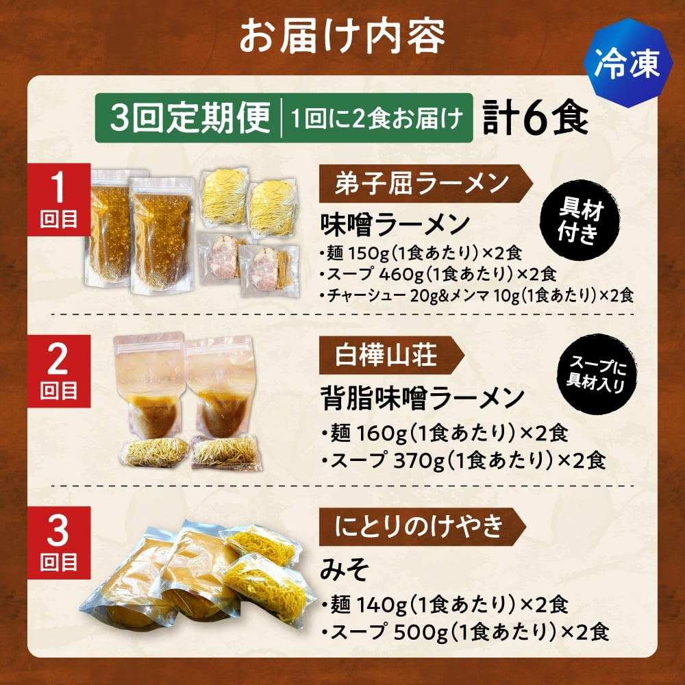 - 【冷凍/3回定期便】 I/札幌味噌 最強王 弟子屈ラーメン・白樺山荘・にとりのけやき(各店2食×3回)| ラーメン みそ 北海道 札幌市