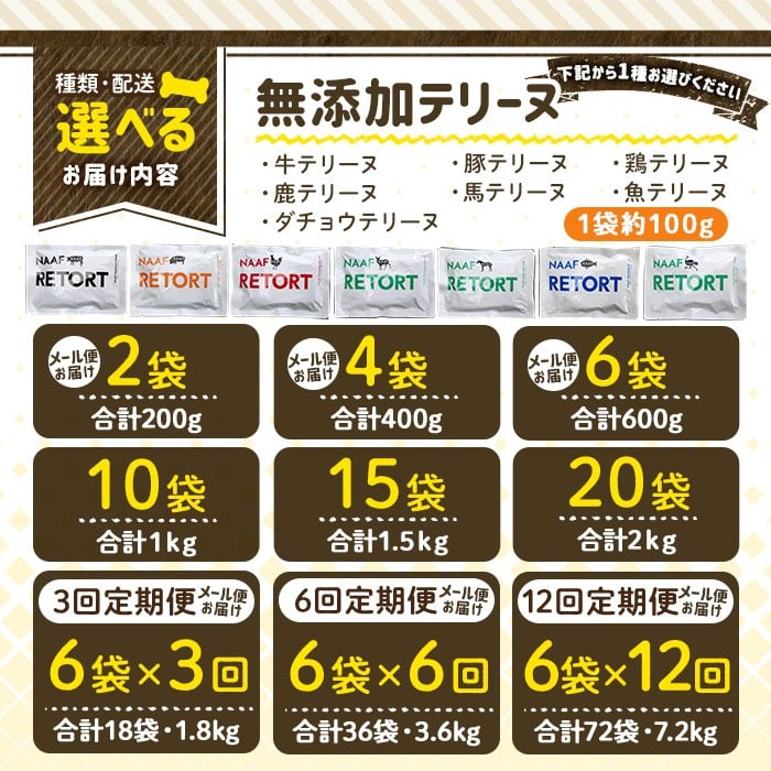 - 《種類・配送が選べる》<保存料・着色料 不使用>愛犬用無添加テリーヌ レトルトパック(2袋~21袋・3回・6回・12回定期便)【Nフードサービス】姶良市 牛 豚 鶏 鹿 馬 魚 ダチョウ テリーヌ 犬 ドッグ ペット フード エサ レトルト おやつ ごはん ご飯 間食 ご褒美 a1084 a1085 a1086 a1087 a1088 a1089 a1090 a1091