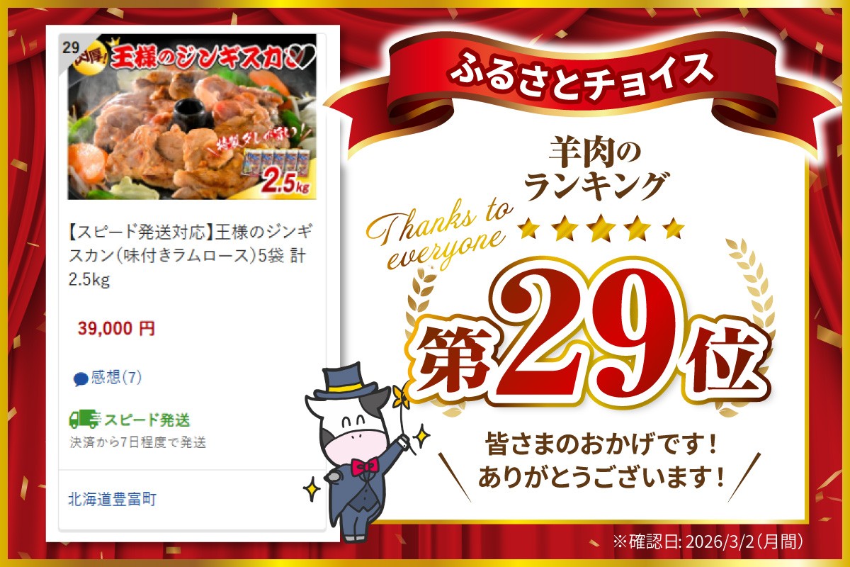 【スピード発送対応】王様のジンギスカン(味付きラムロース)5袋 計2.5kg