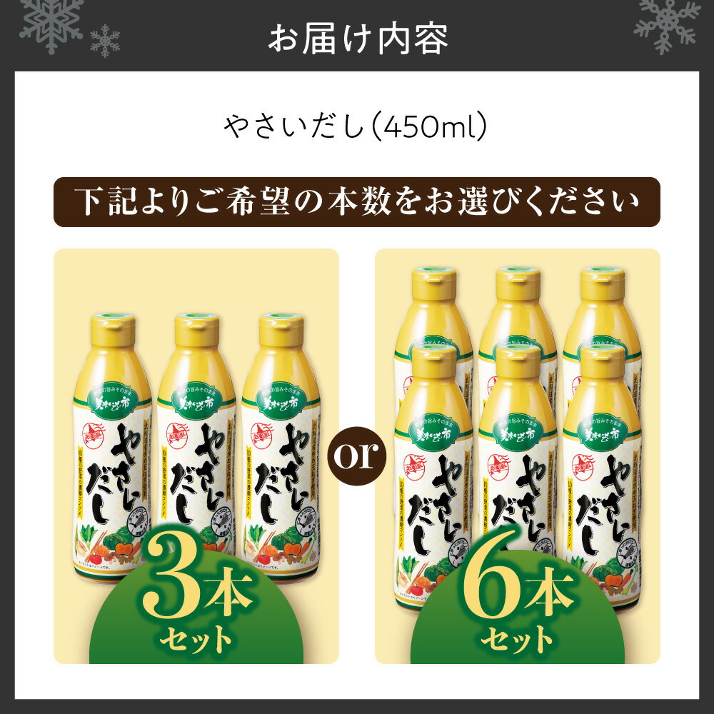 - 【ふるさと納税】 美味いもの市 やさいだし 【 選べる 本数 】 450ml 3本 6本 セット 10種の野菜 だし 出汁 濃縮タイプ コンソメ 洋風 液体 調味料 お取り寄せ ギフト 贈り物 北海道 札幌市