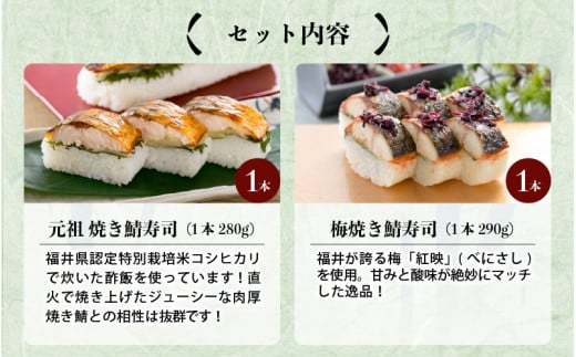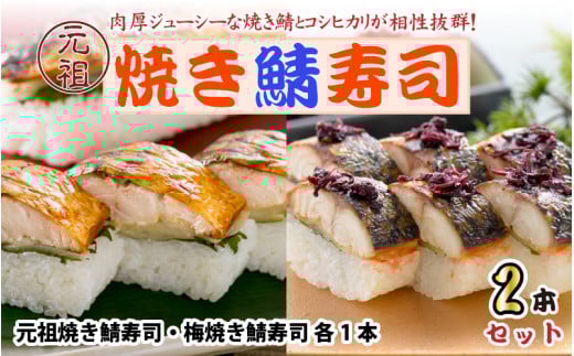 【先行予約】元祖焼き鯖寿司2本セット!「元祖焼き鯖寿司」「梅焼き鯖寿司」 ~家族が喜ぶ手土産~ 【2026年3月下旬より順次発送予定】 【名物 ジューシー 焼きさば 押し寿司 さば寿司 すし こしひかり 贈答 ギフト お土産 大人気 食べ比べ】 [A-0571]