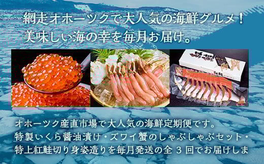- 【毎月定期便】人気の紅鮭、生冷ズワイ蟹しゃぶ、特製いくら醤油漬け80g×3瓶の定期便全3回 【ふるさと納税 人気 おすすめ ランキング 紅鮭 紅ジャケ 鮭 ズワイガニ ずわいがに いくら イクラ イクラ醤油漬 いくら醤油漬 定期便 北海道 網走市 送料無料】 ABAO096