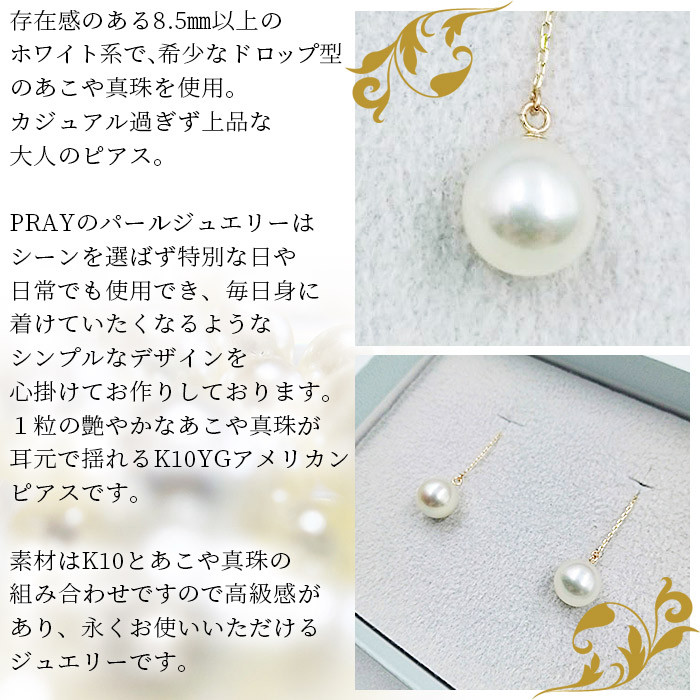 - <明浜産あこや真珠8.5mm K10YGアメリカンピアス> パール ジュエリー アクセサリー フォーマル カジュアル ギフト 西予市 贈り物 祝 冠婚葬祭
