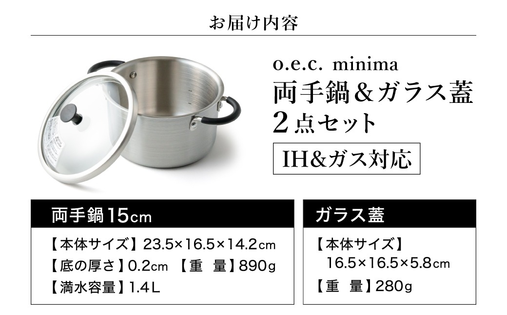 貝印 料理研究家 脇雅世監修 o.e.c ミニマ 両手深型鍋 15cm ガラス蓋付 2点セット 000DY5208 OEC オーイーシー IH ガスコンロ オーブン 対応 関市 キッチンツール 料理 おしゃれ 便利 なべ ナベ ふた フタ