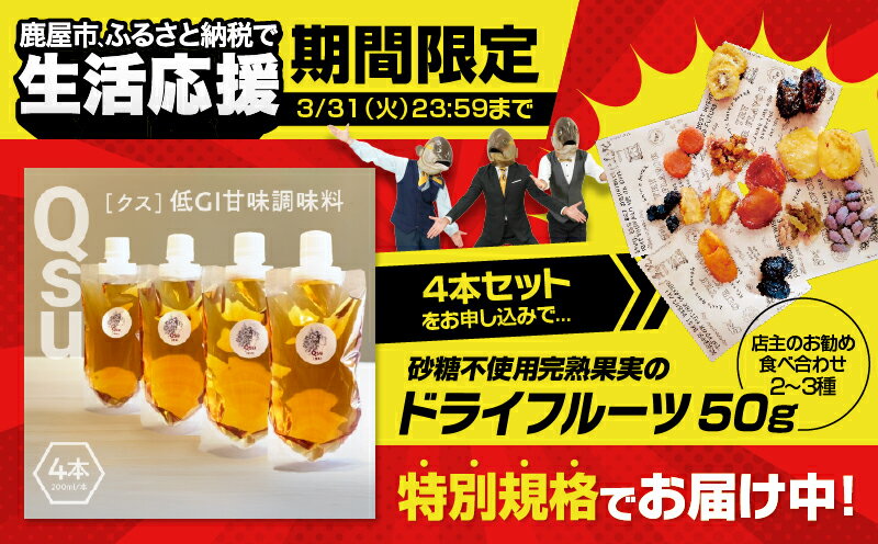 【ふるさと納税】【期間限定 生活応援】<選べる> Qsu クス 低GI 甘味調味料 200ml × 1本 4本 ギフトパック 調味料 砂糖 みりん 酒 糀 酸化 糖化 腸内環境 シロップ 料理 お菓子作り コク 照り 糖質 Bauntfulet 鹿児島 鹿屋市 おすすめ ランキング プレゼント ギフト