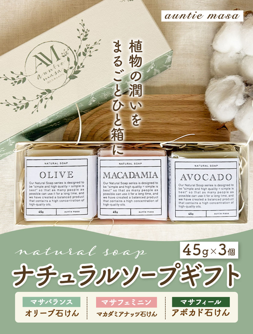 - 【ふるさと納税】石けん ナチュラルソープ 3点セット 45g × 3個 石けん工房アンティーまさ《30日以内に出荷予定(土日祝除く)》熊本県 菊池市 石けん せっけん 石鹸 ナチュラルソープ ソープ オリーブ マカダミアナッツ アボカド 植物オイル ギフト 贈り物