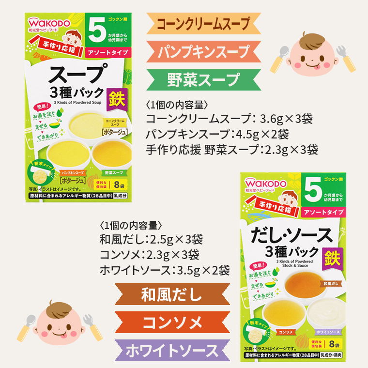 - DK-3 ベビーフード「手作り応援 スープ3種パック」「手作り応援 だし・ソース3種パック」各6個 計12個 和光堂