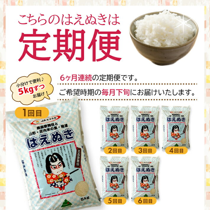 - 【ふるさと納税】≪6ヶ月定期便≫ はえぬき 5kg×6ヶ月連続 計30kg 山形県産 ご希望期間の毎月下旬頃お届け 農協 JA 米 お米 精米 白米 ごはん 東北 酒田市 庄内 3回