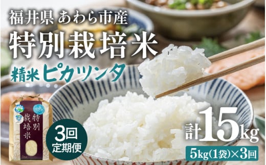 【令和7年産】定期便 ≪3ヶ月連続お届け≫ 化学肥料不使用 特別栽培米 ピカツンタ 精米 5kg × 3回(合計15kg) / 白米 米 福井県あわら市産 美味しい 特別栽培米 減農薬 安心な米 旨味 甘み もっちり 冷蔵保管米 [aw010-c018]