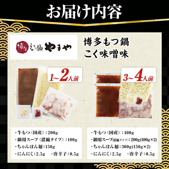 【ふるさと納税】≪内容量選べる≫ 博多もつ鍋やまや もつ鍋セット こく味噌味 (1~4人前) もつ鍋 お鍋 もつ モツ 牛もつ 国産 小腸 牛小腸 博多 味噌味 みそ味 1人前 2人前 3人前 4人前 セット ちゃんぽん麺 チャンポン麺 麺 【やまやコミュニケーションズ】