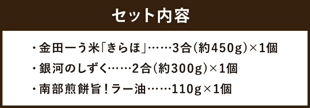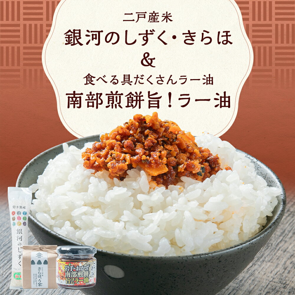 - 【ふるさと納税】二戸産米「銀河のしずく」と「きらほ」&食べる具だくさんラー油 岩手おかず南部煎餅 旨! 3種類セット 【令和7年産】 お米 食べるラー油 二戸市産 岩手県産 東北産 送料無料