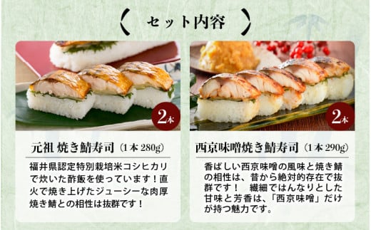 - 【先行予約】元祖焼き鯖寿司4本セット! 「元祖焼き鯖寿司」「西京味噌焼き鯖寿司」 各2本 (計4本) ~家族が喜ぶ手土産~ 【2026年3月下旬より順次発送予定】 【名物 ジューシー 焼きさば 押し寿司 さば寿司 すし こしひかり 贈答 ギフト お土産 大人気 食べ比べ】 [A-0566]