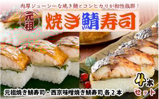 【先行予約】元祖焼き鯖寿司4本セット! 「元祖焼き鯖寿司」「西京味噌焼き鯖寿司」 各2本 (計4本) ~家族が喜ぶ手土産~ 【2026年3月下旬より順次発送予定】 【名物 ジューシー 焼きさば 押し寿司 さば寿司 すし こしひかり 贈答 ギフト お土産 大人気 食べ比べ】 [A-0566]