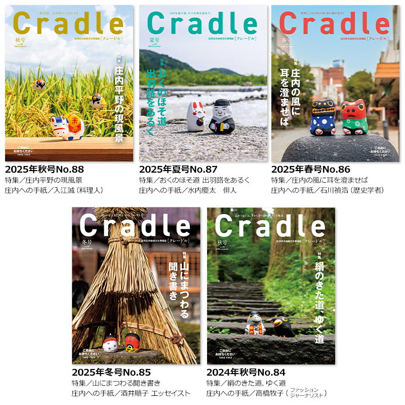 【ふるさと納税】鶴岡の情報満載 出羽庄内地域文化情報誌「Cradle(クレードル)」 新刊2026年冬号 + バックナンバー5冊(2024年秋号〜2025年秋号)【合計6冊】 日本地域情報コンテンツ大賞2021「内閣府地方創生推進事務局長賞」最優秀賞 受賞誌 | 山形県 鶴岡市