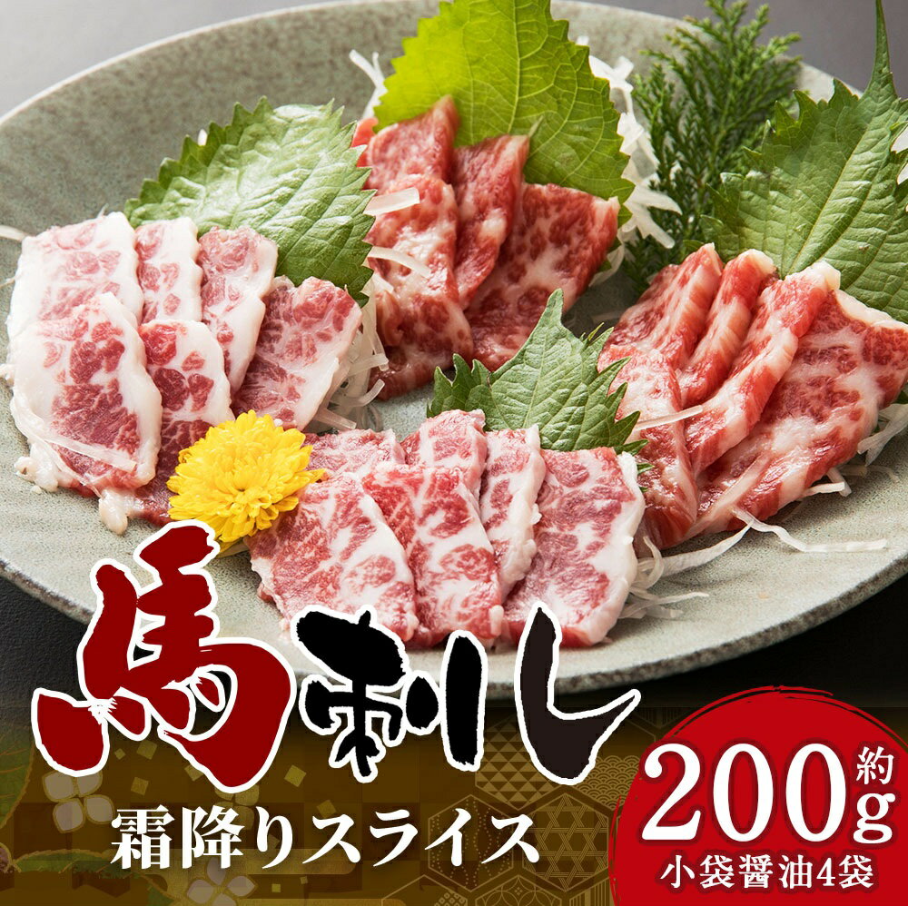 【ふるさと納税】馬刺し 霜降りスライス 約200g(約100g×2パック) 醤油4袋 馬刺し 霜降り スライス済み 馬肉 刺身 おつまみ 冷凍 送料無料