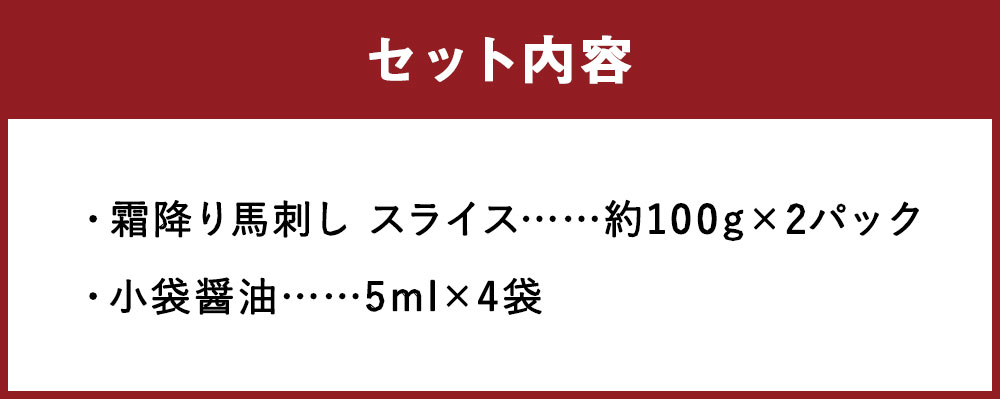 - 【ふるさと納税】馬刺し 霜降りスライス 約200g(約100g×2パック) 醤油4袋 馬刺し 霜降り スライス済み 馬肉 刺身 おつまみ 冷凍 送料無料
