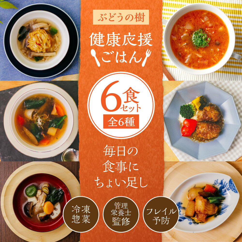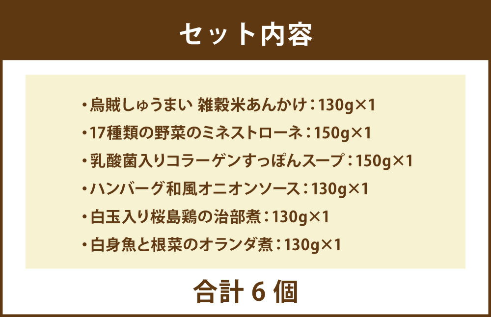 - 【ふるさと納税】【毎日の食事にちょい足し】ぶどうの樹の「健康応援ごはん」 6食セット しゅうまい ミネストローネ すっぽんスープ ハンバーグ 治部煮 オランダ煮 計820g 魚介類 野菜 桜島鶏 お肉 煮物 惣菜 おかず ごはんのお供 ご飯のお供 冷凍 福岡県 岡垣町 送料無料
