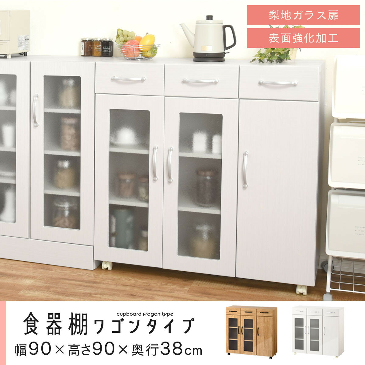 - 【ふるさと納税】【完成品でお届け】キッチン収納〔食器棚・ワゴンタイプ〕(選べる2色)食器棚 ロータイプ 木製 キャスター付き 幅 90cm キッチンワゴン 引き出し キッチン 収納 ワゴン ガラス扉 カップボード キッチン収納棚 KKANCBJ01120