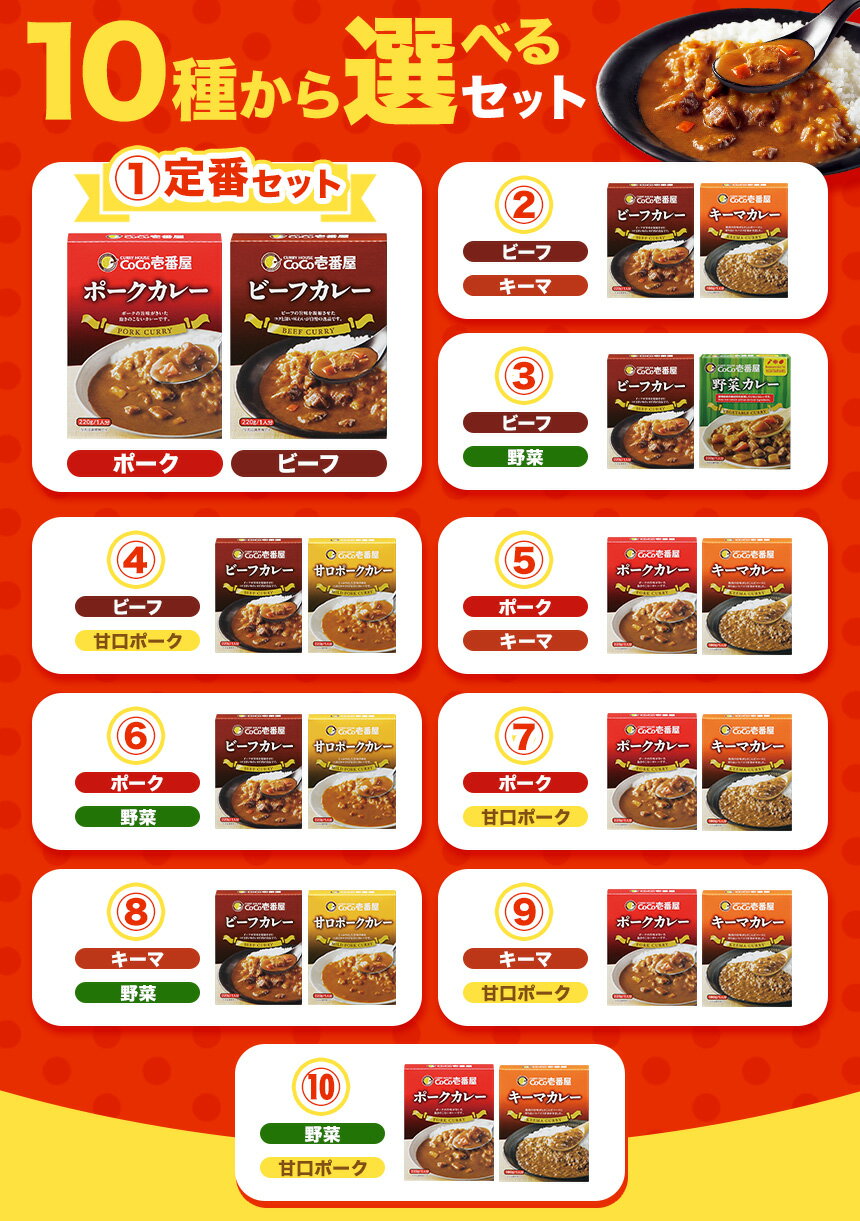 - 【ふるさと納税】レトルト カレー ココイチ 合計10個 5種類からお好きな 2種類 選べる 各5個 | 楽天限定 企画 レトルト ビーフ ポーク キーマ 野菜 甘口 | レトルトカレー CoCo 壱番屋 CoCo壱番屋 非常食 備蓄 長期保存 簡単 時短 キャンプ 人気 定番 ご飯 栃木県 矢板市