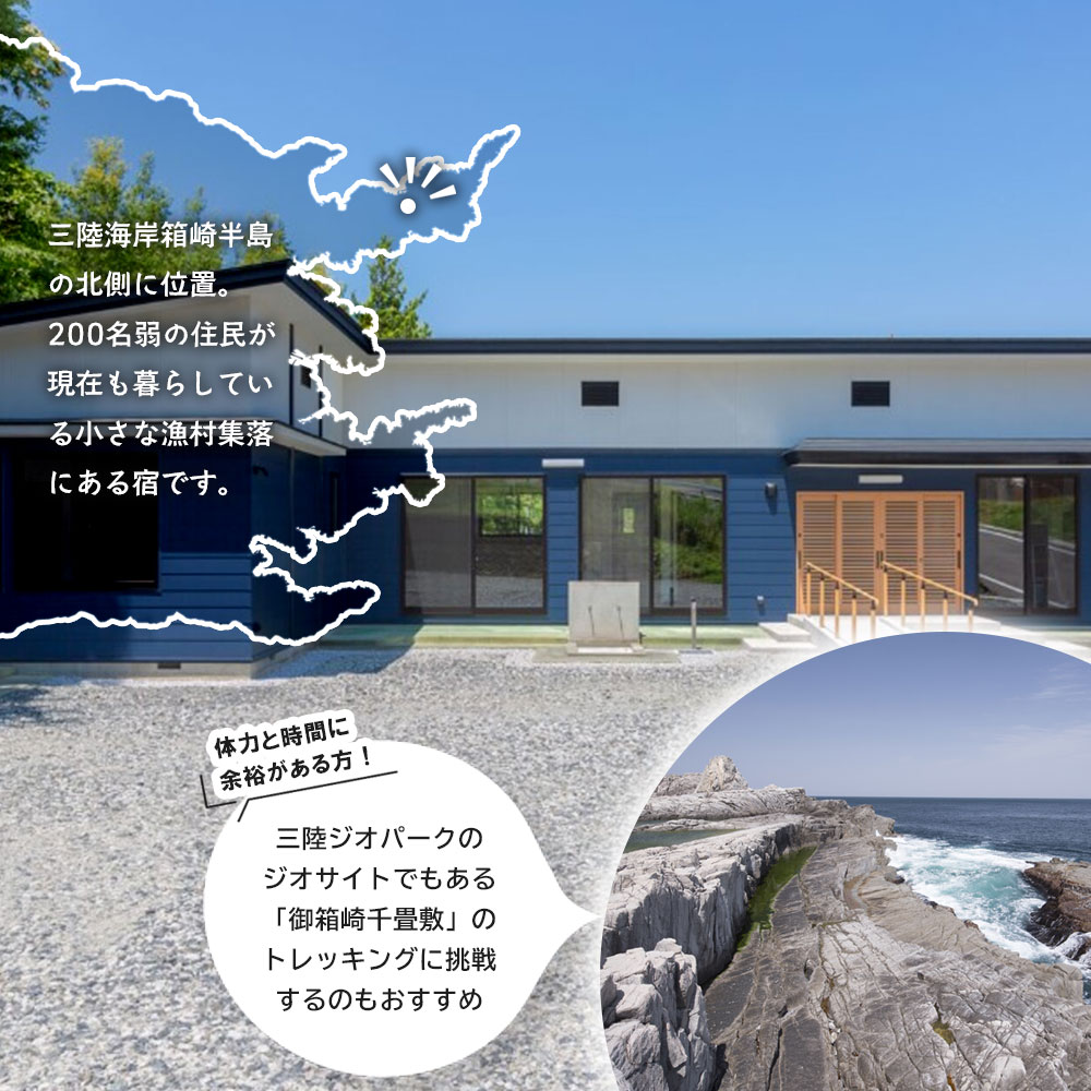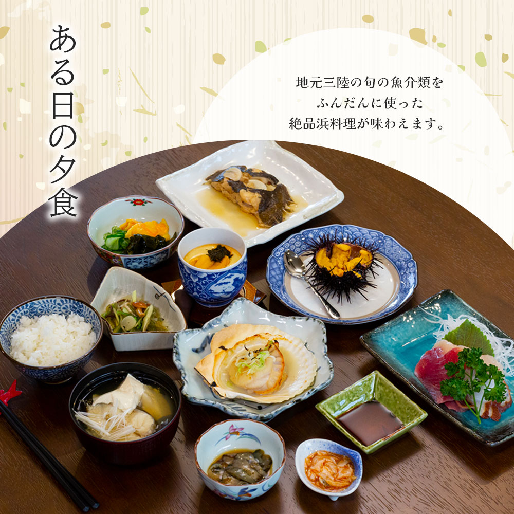 - 【ふるさと納税】 【御箱崎の宿】一棟貸しのお宿で三陸絶品浜料理のお食事! ペア宿泊券 (1泊2食付プラン) 岩手県 釜石市 箱崎町 東北 宿泊券 一棟貸し 宿 三陸 浜料理 朝夕食事つき 民泊 ジオパーク 千畳敷