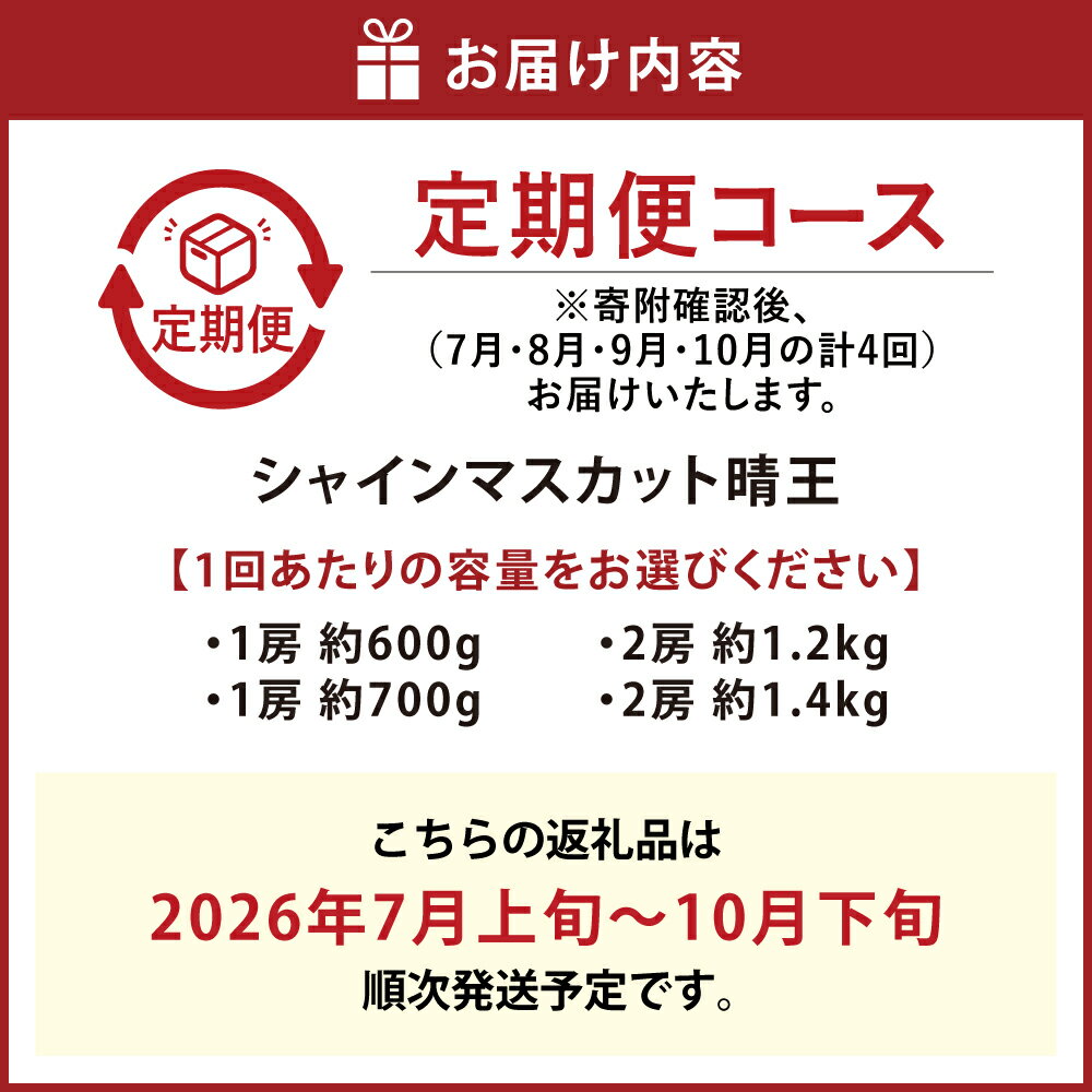 - 【ふるさと納税】<選べる内容量>[HS]【4回定期便】温室・露地 シャインマスカット 晴王 1回あたり1房 / 2房 約600g / 約700g / 計約1.2kg / 計約1.4kg ぶどう ブドウ 葡萄 フルーツ くだもの 果物 冷蔵 国産 岡山県産 倉敷市 送料無料 【2026年7月上旬~10月下旬発送予定】
