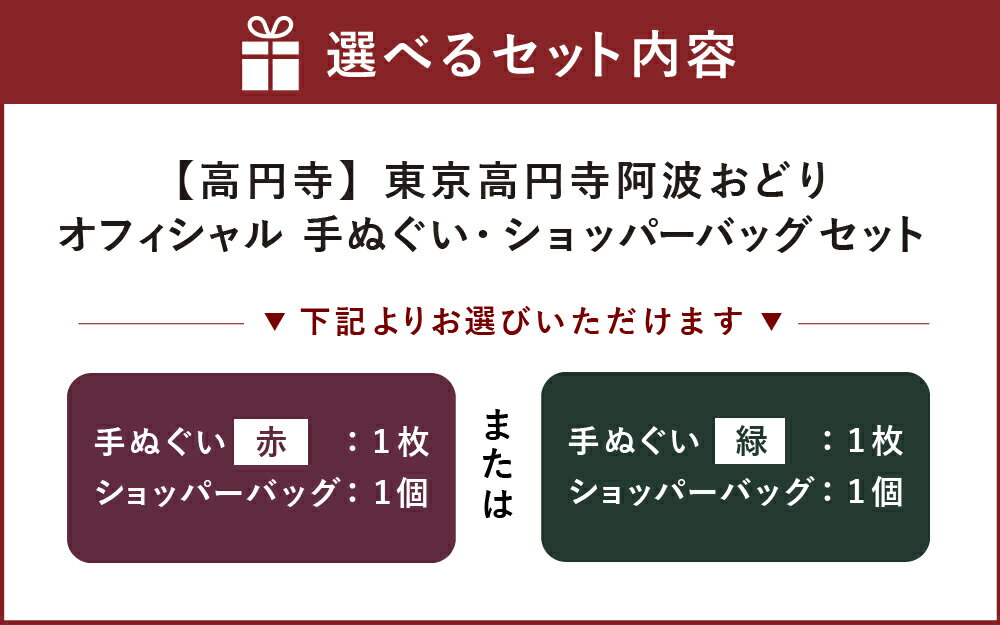 - 【ふるさと納税】【高円寺】東京高円寺阿波おどりオフィシャル 手ぬぐい <選べるカラー>(赤 / 緑)・東京高円寺阿波おどりオフィシャル ショッパーバッグセット 【2025年版】 バッグ かばん カバン 鞄 手拭い 小物 雑貨 東京都 杉並区 送料無料