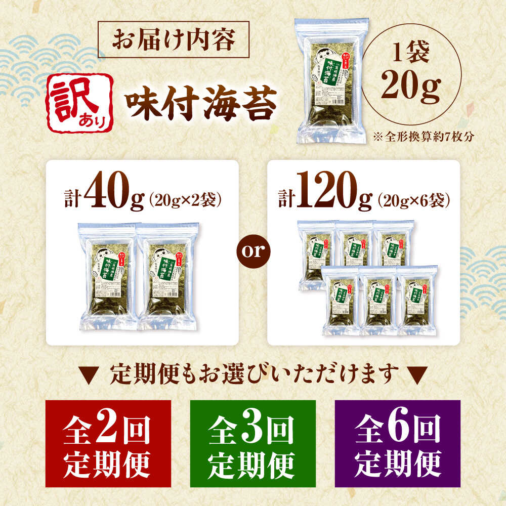 - 【ふるさと納税】【選べる容量・回数】福岡有明のり 訳あり! 味付海苔 20g 2袋 or 6袋 桂川町/株式会社木村食品[ADCG034]