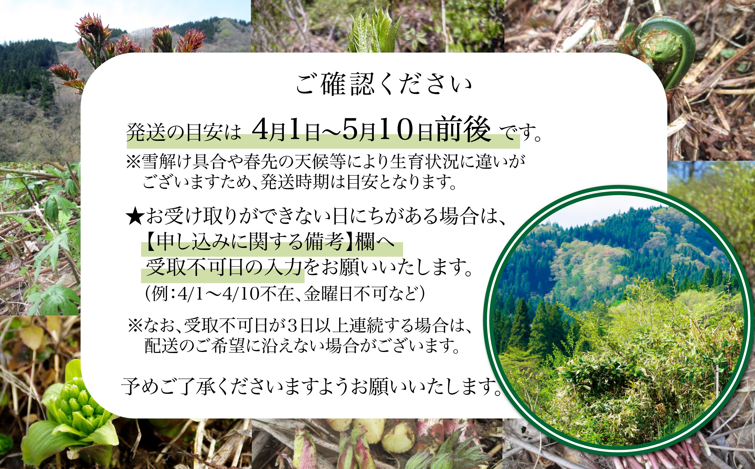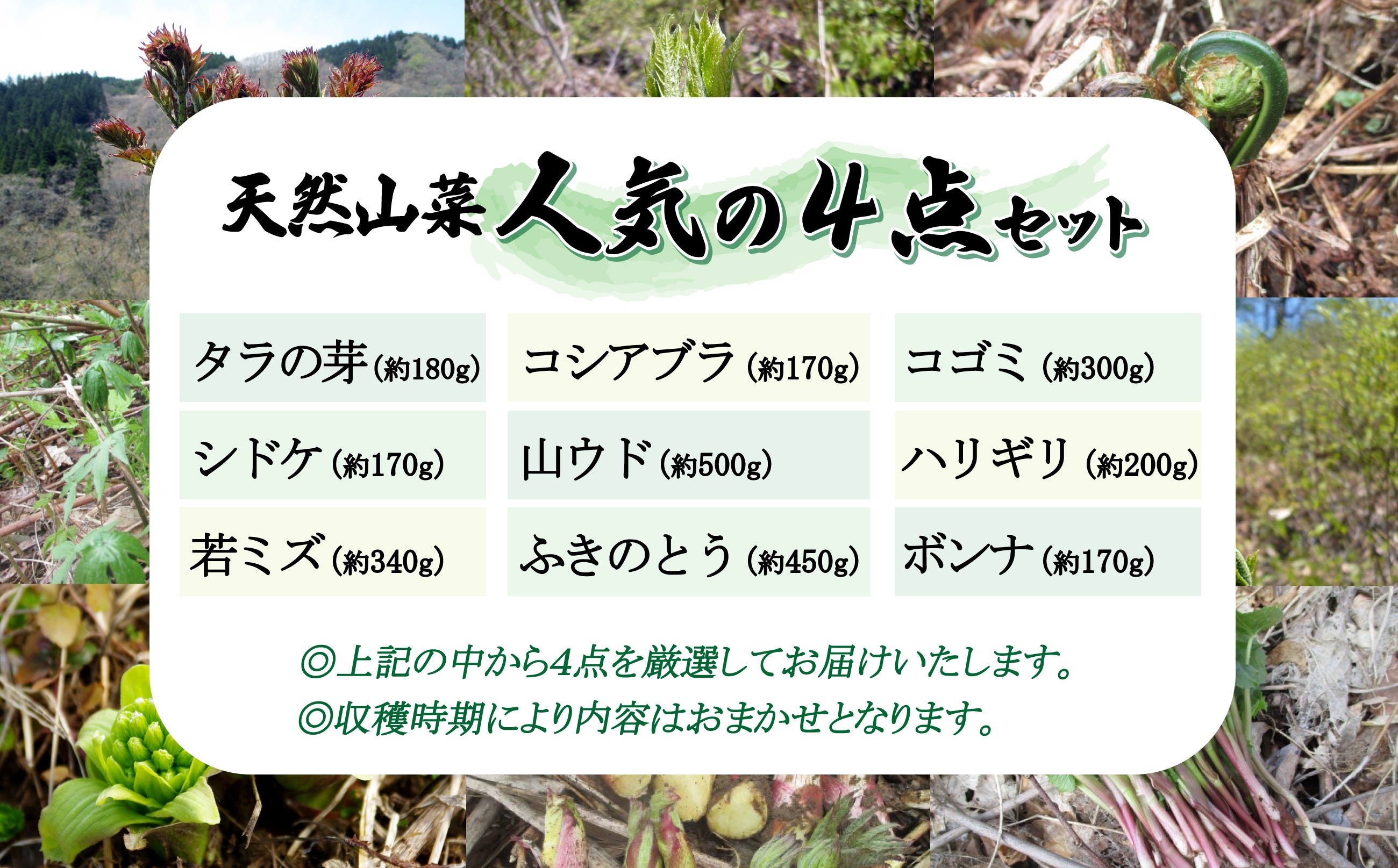 - 予約受付【天然山菜】人気の4点セット 75P3208 / 山菜 天然 山 自然 こしあぶら コシアブラ たらの芽 たらのめ タラノメ しどけ シドケ こごみ コゴミ ウド うど ふきのとう フキノトウ はりぎり ハリギリ みず ミズ ぼんな ボンナ 東北 秋田 大館 春の山菜 山菜セット 山菜詰め合わせ 春の山菜詰め合わせ 天然もの 天然山菜 天然山菜セット 天然山菜詰め合わせ