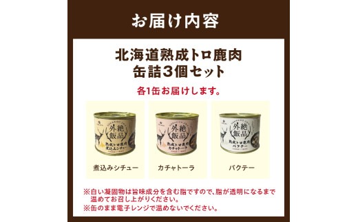《14営業日以内に発送》北海道熟成 トロ鹿肉の缶詰 3缶セット バクテー・カチャトーラ・煮込みシチュー ( エゾ鹿 エゾシカ 肉 熟成 缶詰 北海道 ジビエ キャンプ アウトドア )【125-0083】