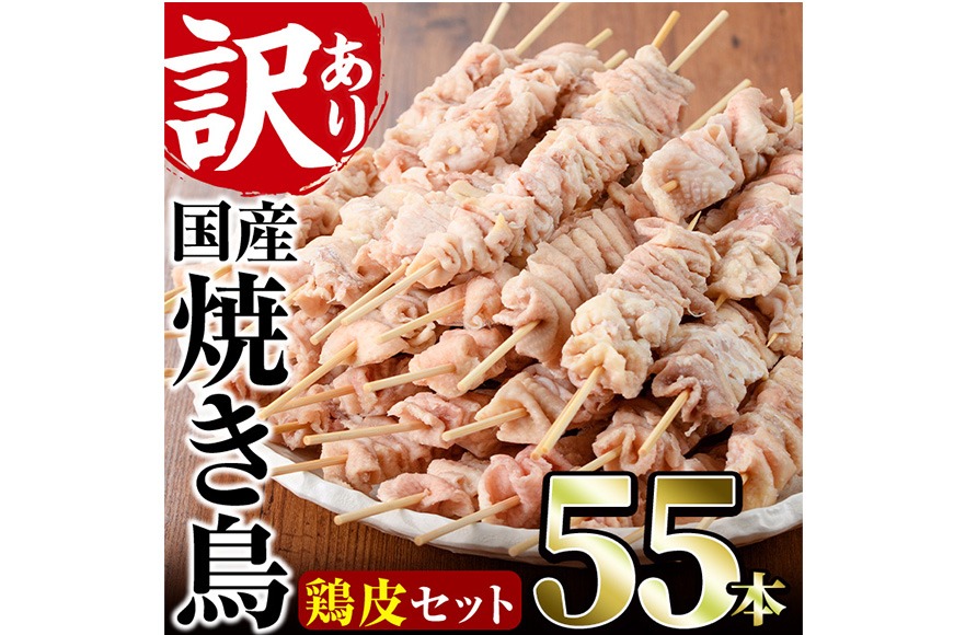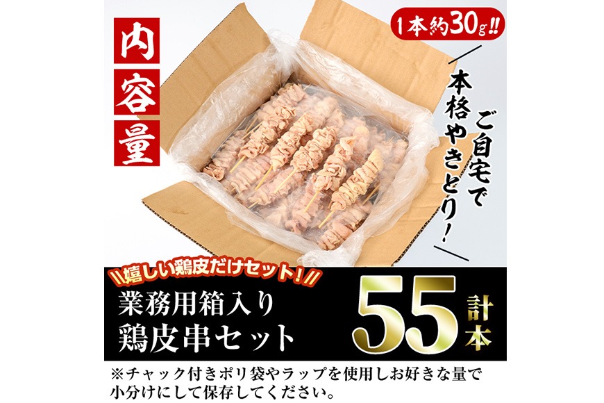 <訳あり>業務用箱入り国産焼き鳥鶏皮セット(55本)焼鳥 やきとり 鳥皮 とりかわ とり皮 グルメ お惣菜 おつまみ 冷凍 宮崎県 門川町【V-18】【味鶏フーズ 株式会社】