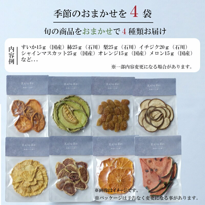 - 【ふるさと納税】 Kaju Re:ドライフルーツ 季節のおまかせ4種セット ドライフルーツ フルーツ おやつ お菓子 おかし グルメ お取り寄せ お中元 お歳暮 ギフト 小松市 石川県 014035【Kaju Re:】