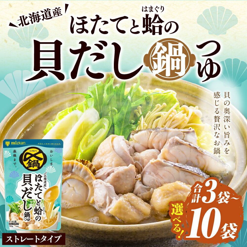 - 【ふるさと納税】《TVで紹介》ミツカン 〆まで美味しい 北海道産ほたてと蛤の貝だし鍋つゆ ストレート ( 750g×3袋 / 750g×6袋 / 750g×10袋 ) <選べる容量> mizkan 鍋つゆ お鍋 鍋 なべ 鍋用 鍋の素 だし 出汁 ほたて ホタテ 帆立 はまぐり ハマグリ 蛤 送料無料