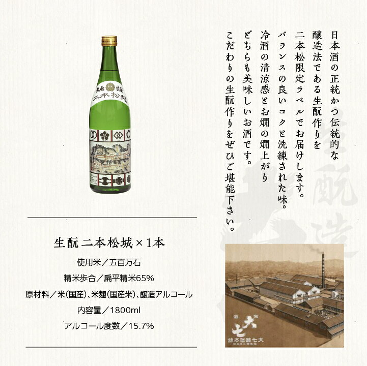 - 【ふるさと納税】 大七酒造「生もと二本松城」1800ml×1本 大七 日本酒 酒 1800 アルコール 本醸造 酒造 酒蔵 生もと さけ おすすめ お中元 お歳暮 ギフト 二本松市 ふくしま 福島県 送料無料 【道の駅「安達」智恵子の里】