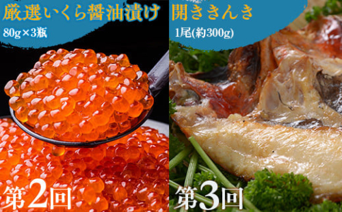 - 【毎月定期便】オホーツク海の人気の紅鮭1尾、いくら醤油漬け、開ききんき1尾の定期便全3回 ABAO091
