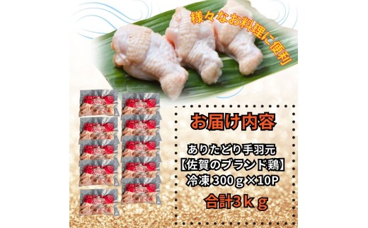 佐賀県ブランド鶏 ありたどり 手羽元 3Kg(300g×10P) 188-L071