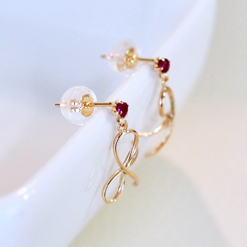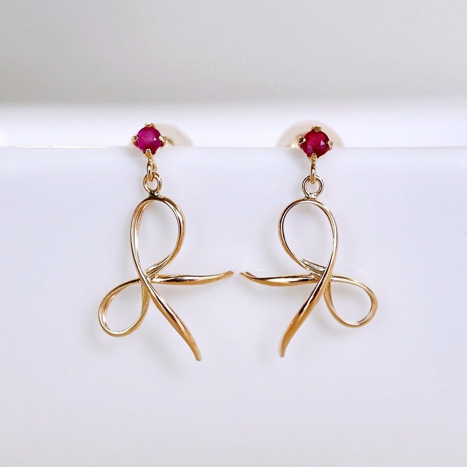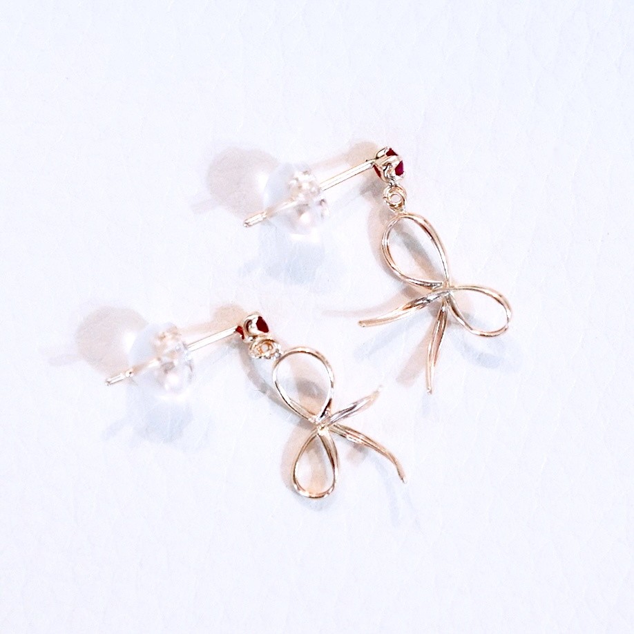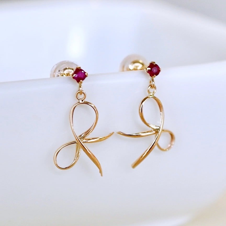 K10YG(10金) イエローゴールド 揺れる リボン ルビー 地金 ピアス 保証書付 SR-2370 242-056-d