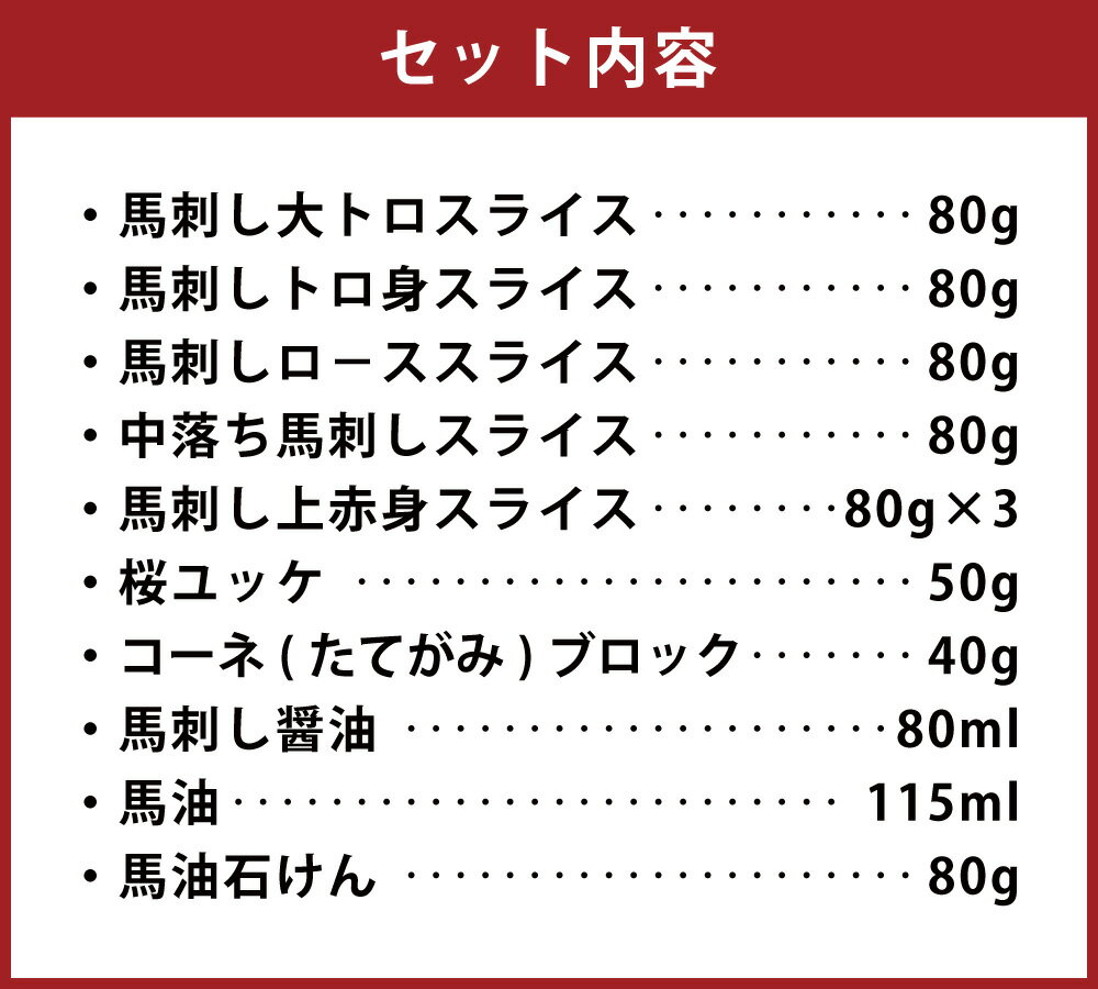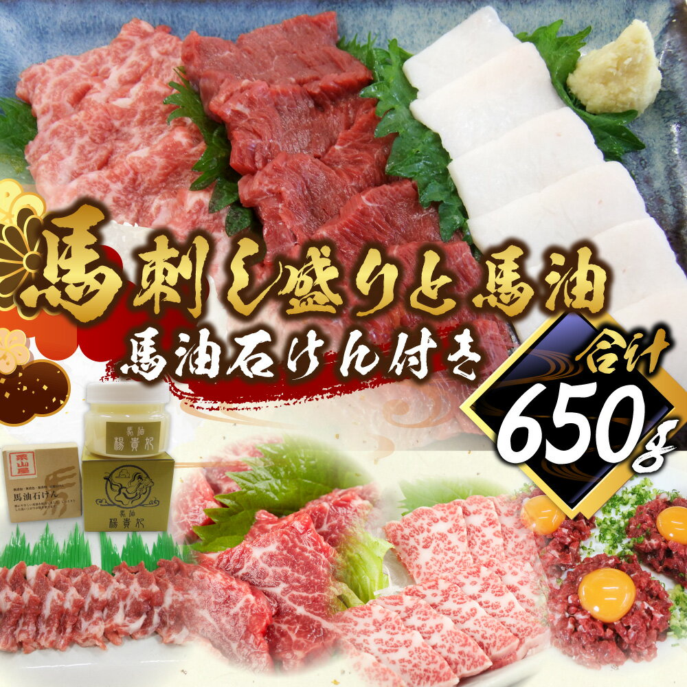 【ふるさと納税】馬刺し盛りと馬油 馬油石けん付き 馬肉7種 馬刺し合計約650g 化粧品2種 合計9種 大トロ トロ身 ロース 中落ち 上赤身 ユッケ コーネ たてがみ 赤身 馬肉 馬油 石鹸 せっけん セット 刺し身 真空パック 食べ比べ 冷凍 送料無料