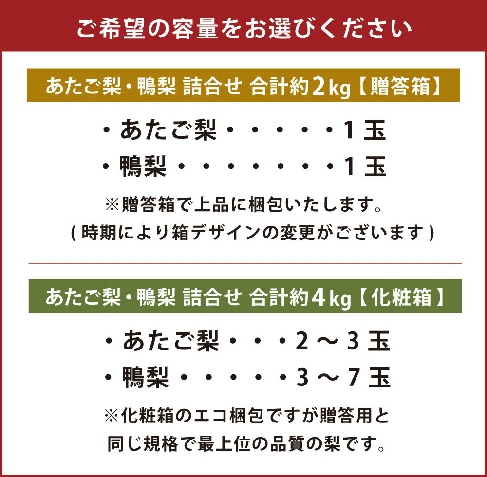 【ふるさと納税】あたご梨・鴨梨(ヤーリー)詰合せ セット 〈選べる〉 合計 約2kg(贈答箱)または 合計約4kg(化粧箱) 愛宕梨 なし ナシ フルーツ くだもの 果物 果実 岡山県産 岡山県 美咲町 送料無料 【2026年11月下旬~12月下旬発送予定】